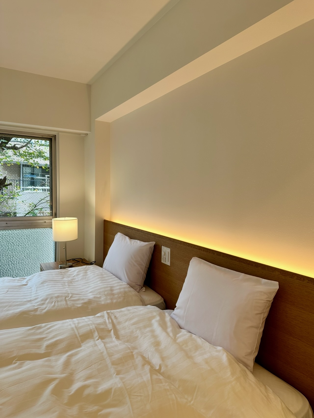 ベッドヘッドの間接照明は、光そのものではなく“気配”を感じる演出にしています。