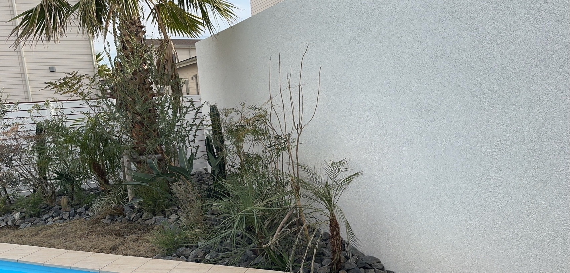 白壁の余白と、リゾート感ある植栽が、花嫁の存在を引き立てる背景となります。