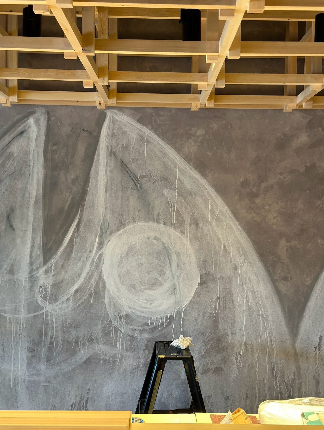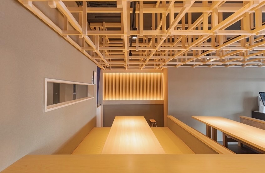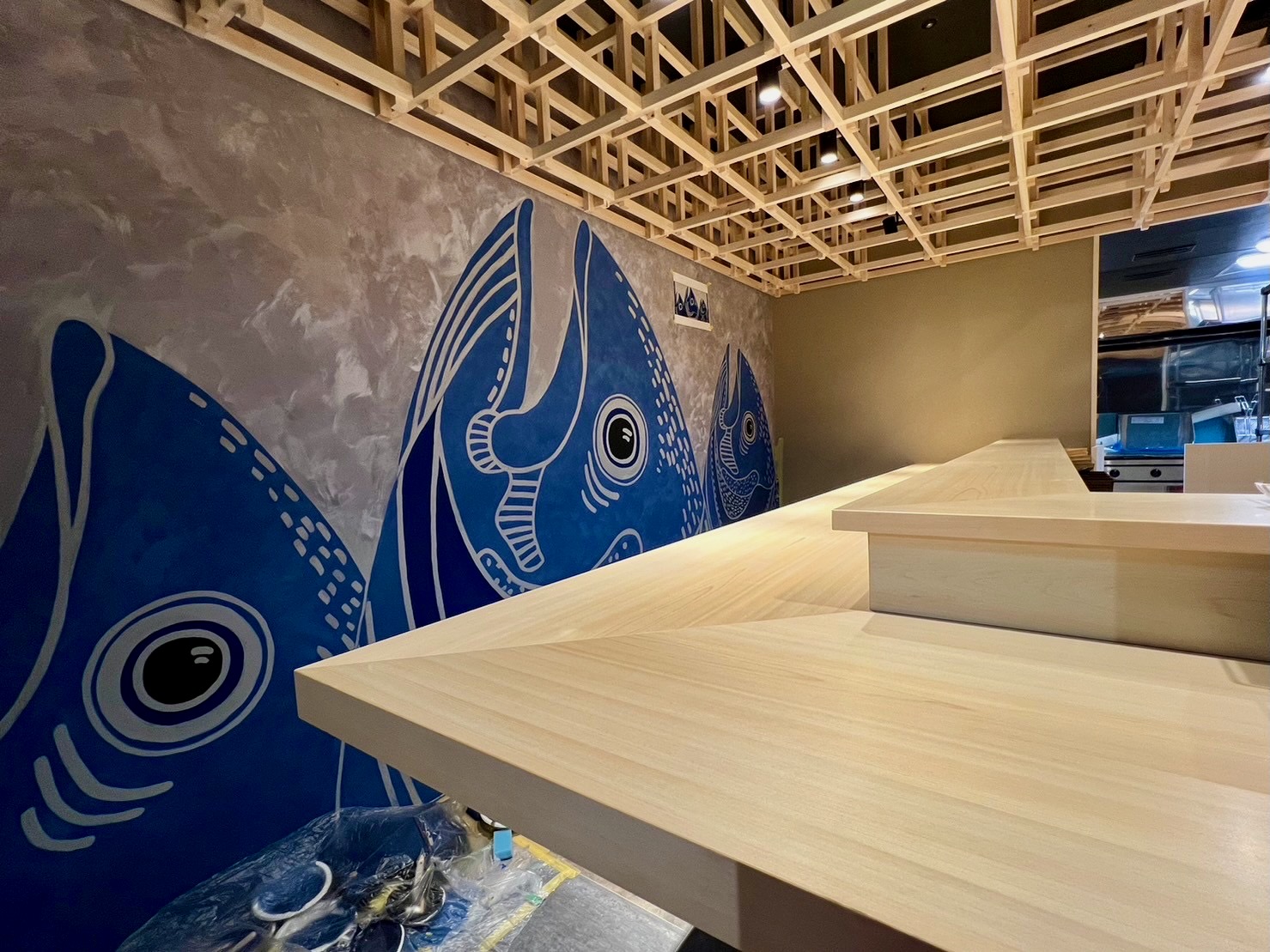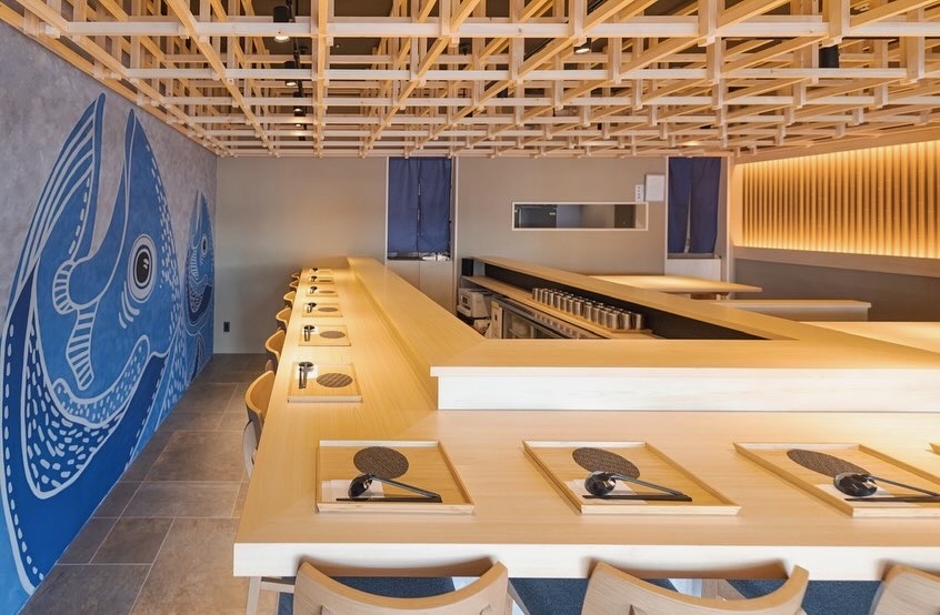 和の伝統技法を想起させる木組天井と、青の魚壁画が印象的な空間です。