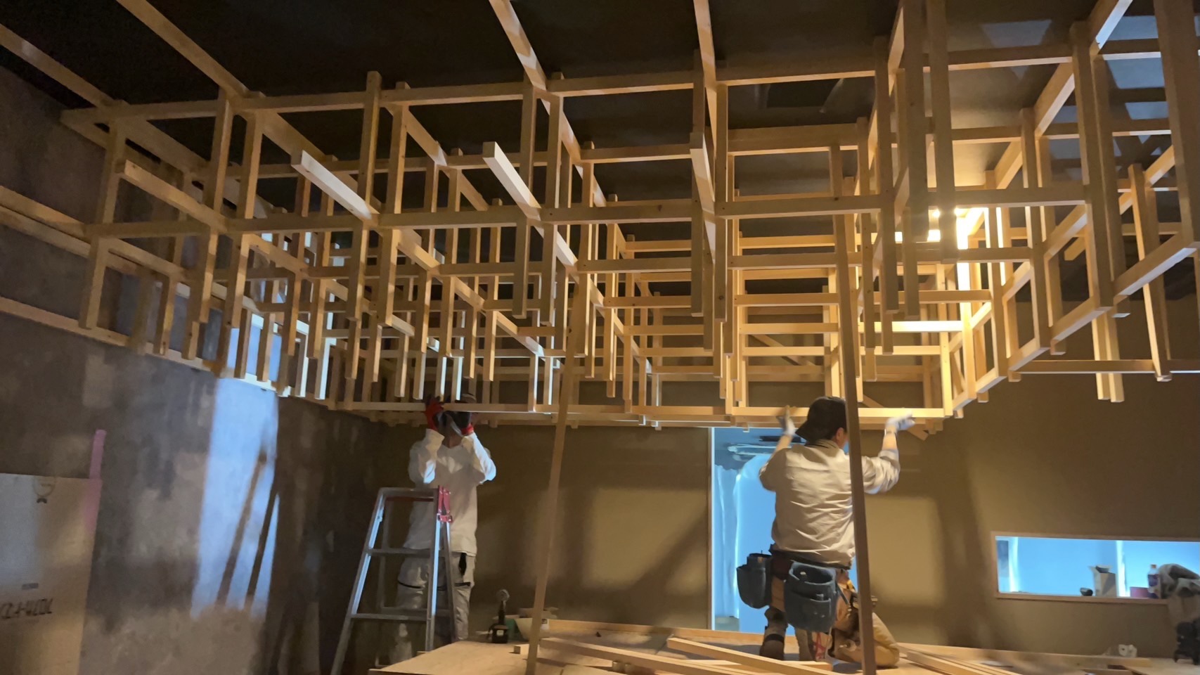 天井の木組みは、伝統構法の抽象化として設計し、視線を引き上げながらも圧迫感のない構成に。