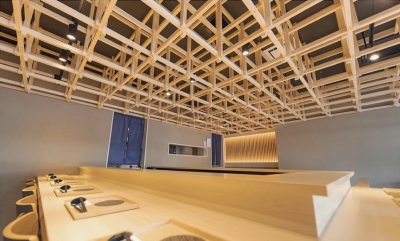 和の伝統技法を想起させる木組天井と、青の魚壁画が印象的な空間です。