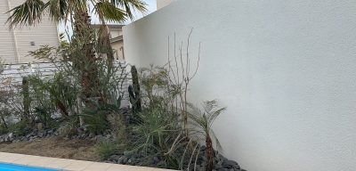 白壁と南国植栽が演出する、屋外リゾート空間|ウェディングスタジオ外構デザイン